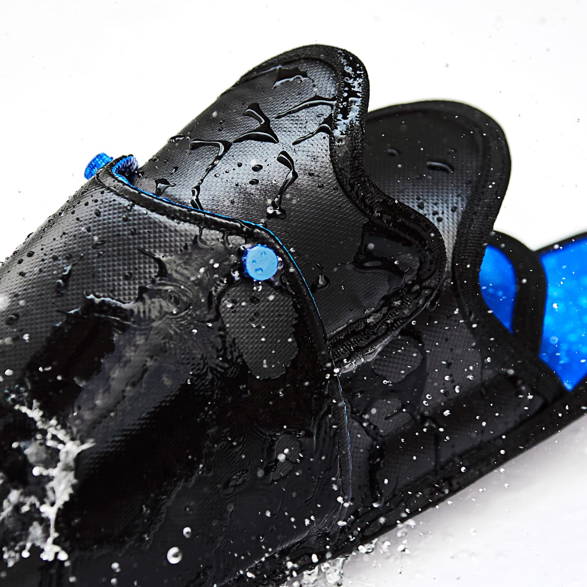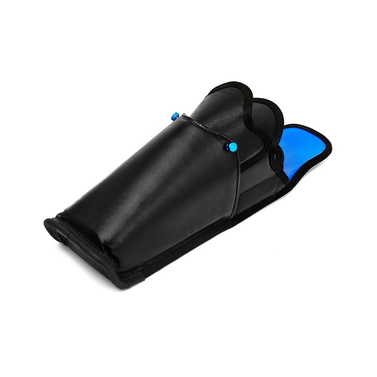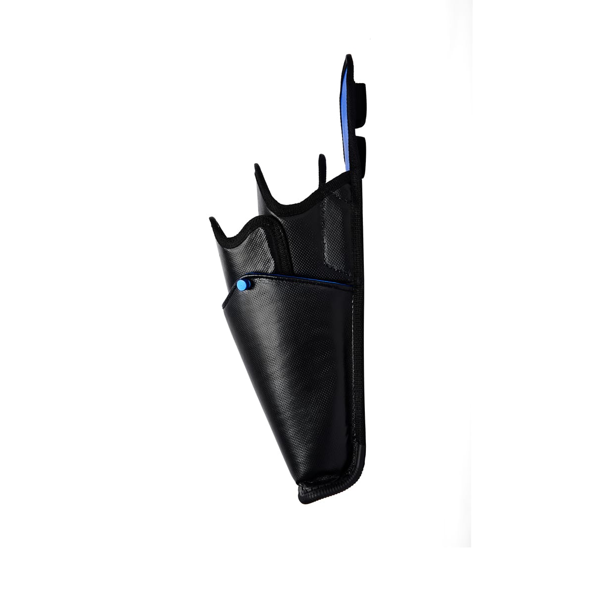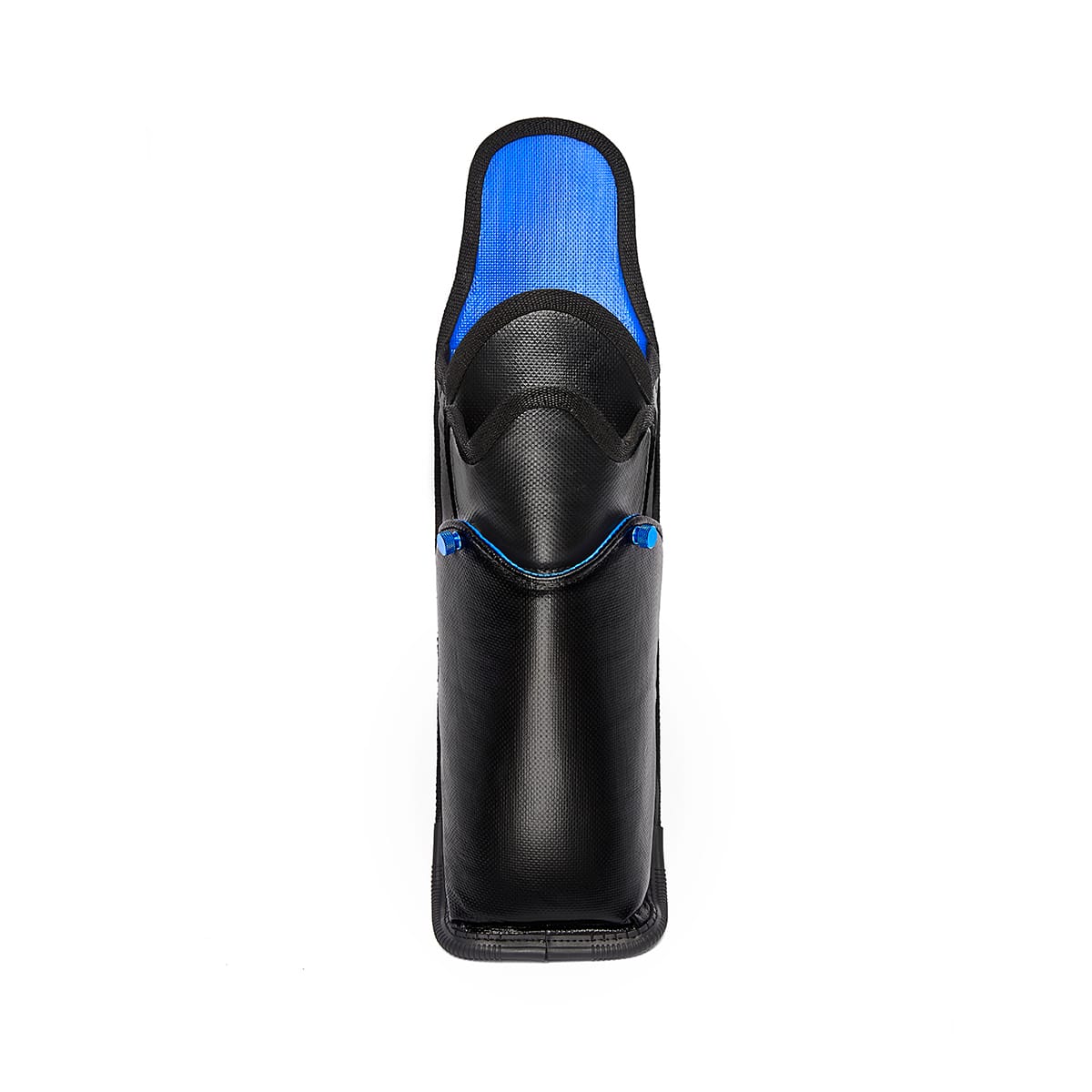 Note the 'TOE' of this holster. All REACH-iT Holsters have 'bent up toes' like Dutch Clogs, compared to the 'long straight toe going to a point'. Our first generations had long toe design, and we got lots of complaints of leaking - it turns out that a majority of them were with guys that were under 5FT9" tall! When they kneel to clean ground glass, they were scraping the bottom edge on the ground and ultimately compromising the glued seal along that edge. We bent the bottom edge up 1", and added a super strong steel/rubber edge so it is impossible to induce a leak, even if you are 5FT4" !