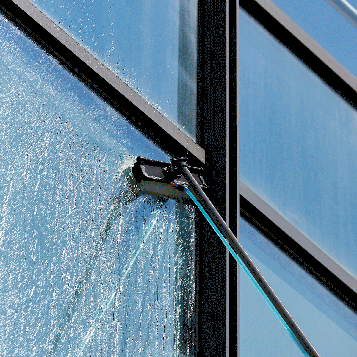 Regarding the Operators’ Technique, DEEP-FRAME ROCKER is purely an UP-DOWN brush for DEEP-FRAME windows - the rinse bar will wet the top frame, but the water will not run back down the window, and there is rarely a build-up of dirt on the underside of the mullions (at 90 degrees to the glass) compared to low-profile frames which have much more surface parallel to the glass.