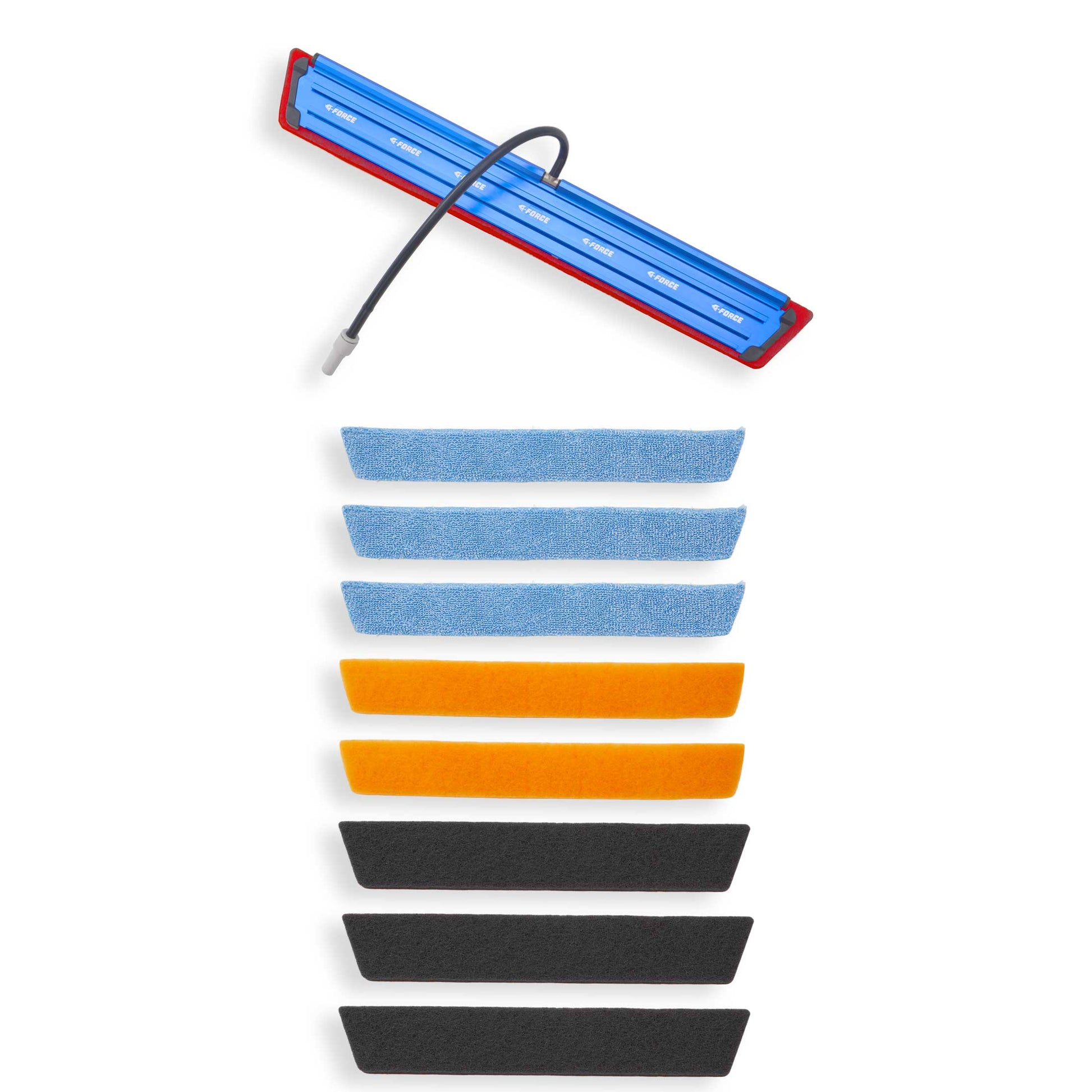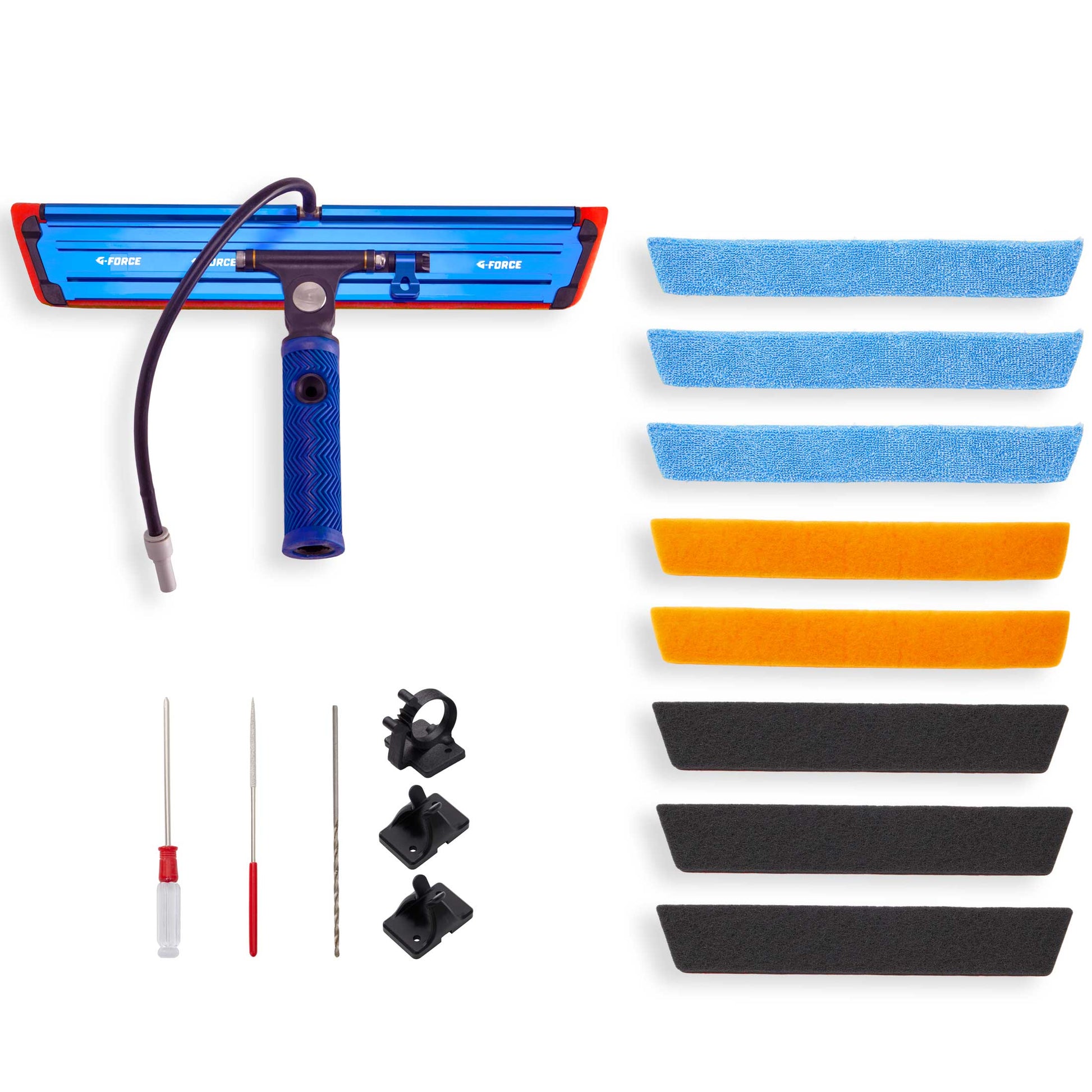 With your G-FORCE, you will receive all-new CARBORUNDUM Non-Scratch SCRUBS, WHITE NON-SCRATCH SCRUBS, MAGIC ERASER, MICROFIBER, GREEN RUBBER and the all-new Bee Poo eater, the TOM CAT SCRUB. Use the right SCRUB to agitate most difficult-to-remove debris off glass.
