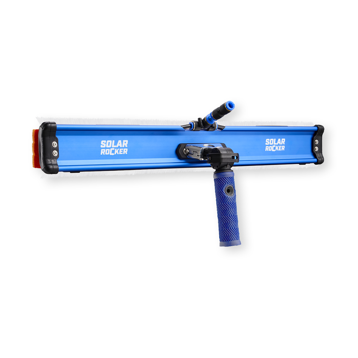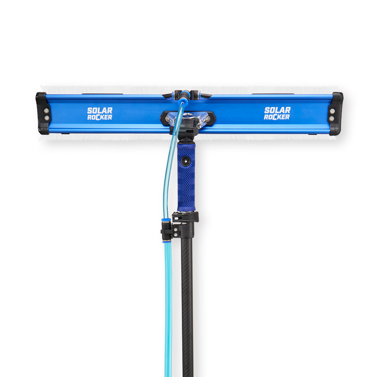 5/.  Remember that PIVOT on the SOLAR ROCKER is able to be set at a negative angle, and with our ALUMINUM GOOSENECK (included) you can be cleaning panels from the apex of the roof, with your rinse bar still on the 'low side'.
